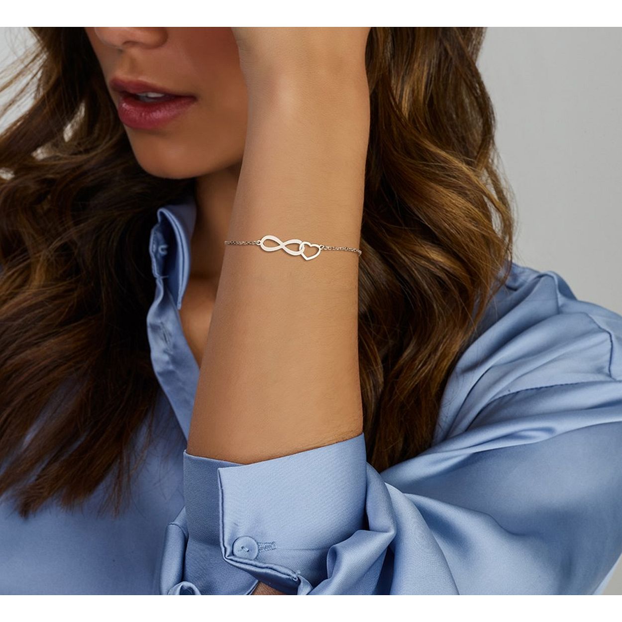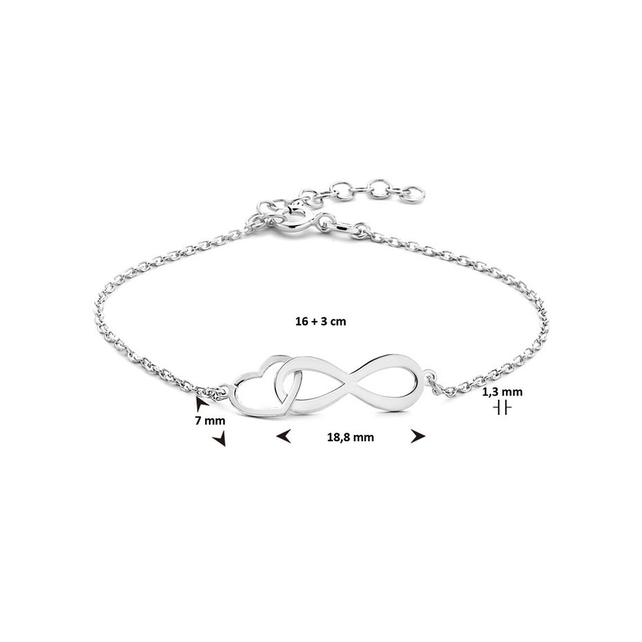 Gerhodineerd 925 zilveren armband uitgevoerd met een infinity teken en een hartje. De armband heeft een draaglengte van 16cm met een extensie van 3cm. Het infinity teken heeft een afmeting van 6.5x18.8mm en het hartje heeft een afmeting van 7x9mm.