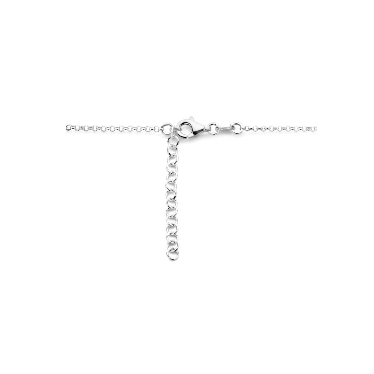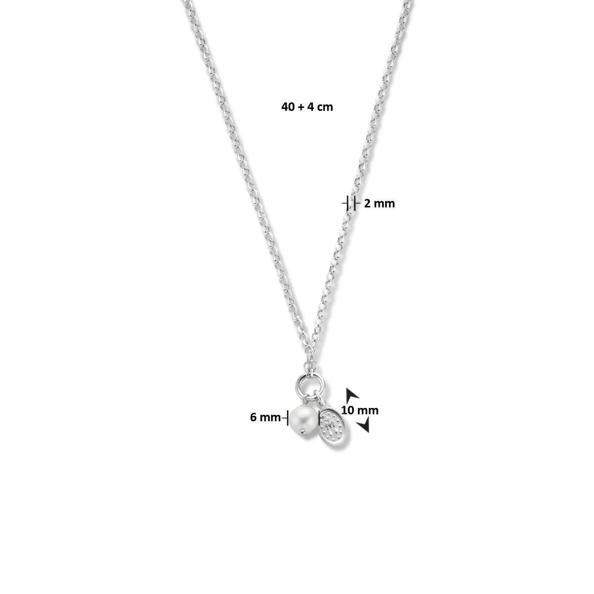 Gerhodineerd 925 zilveren collier uitgevoerd met een zoetwaterparel en een scapulier. Het collier heeft een draaglengte van 40cm met een extensie van 4cm en een stevige karabijn sluiting.