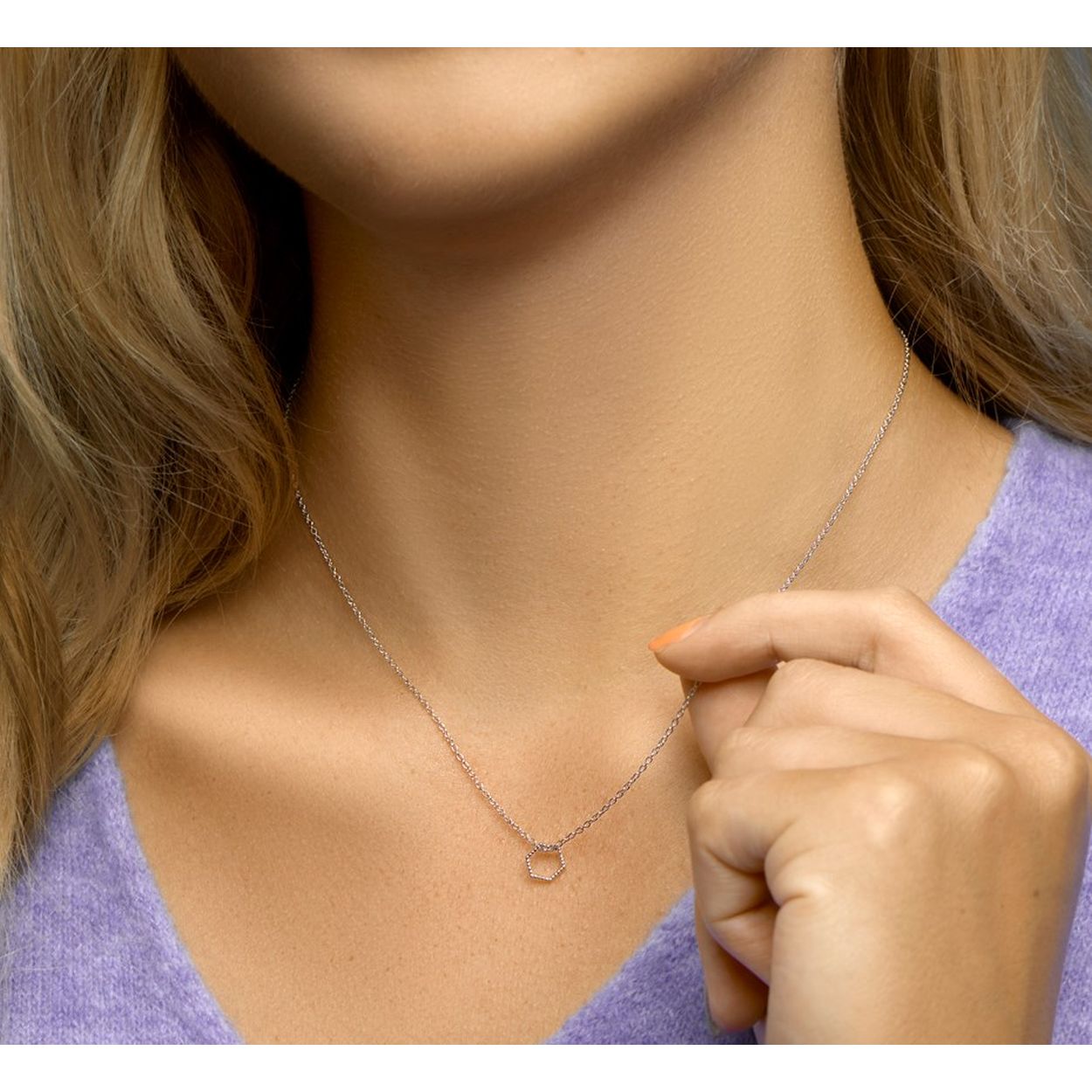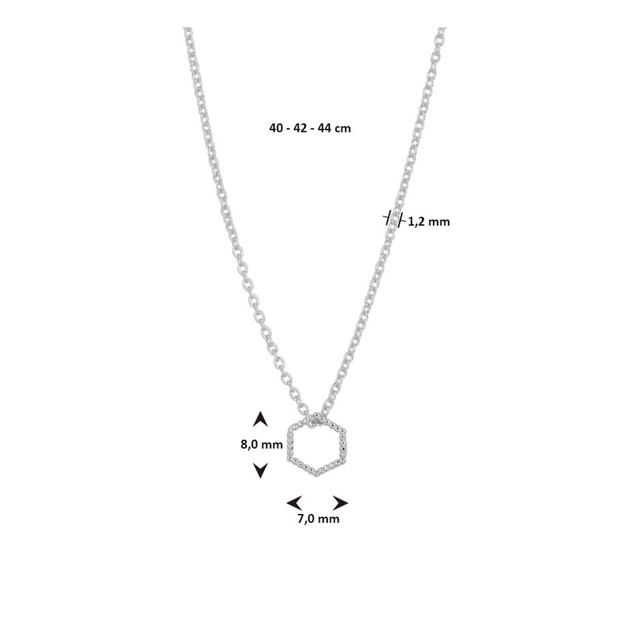 Gerhodineerd 925 zilveren collier uitgevoerd met een hangertje in de vorm van een zeshoek. Het collier heeft draaglengtes van 40, 42 en 44cm. Het hangertje heeft een afmeting van 8x7mm.