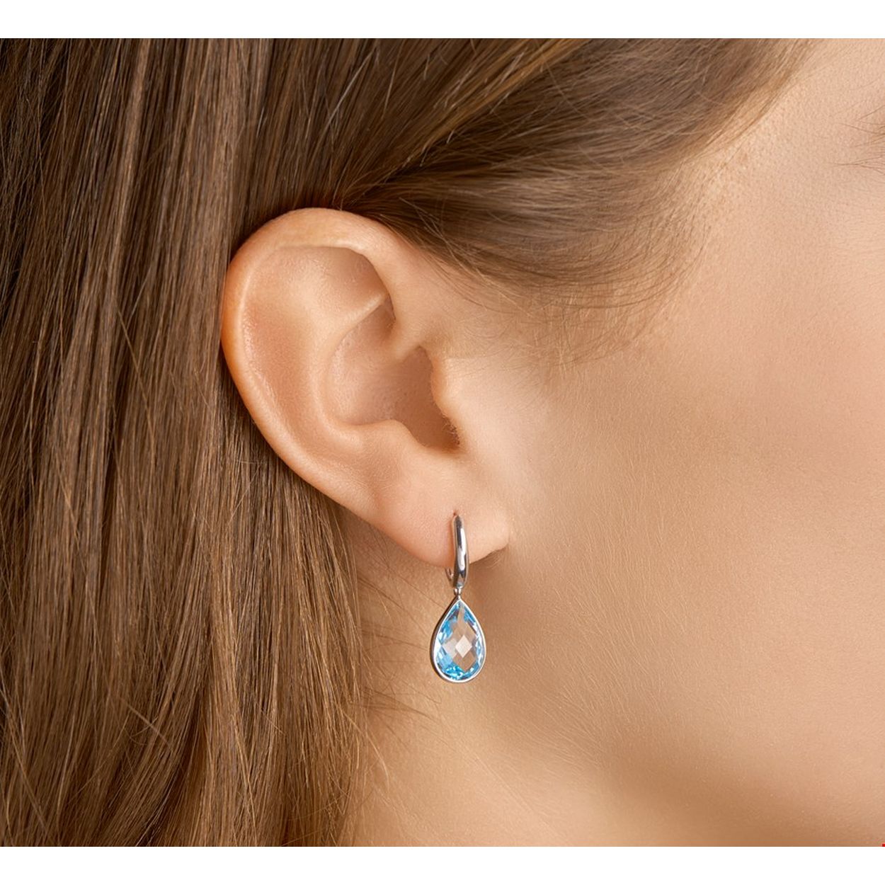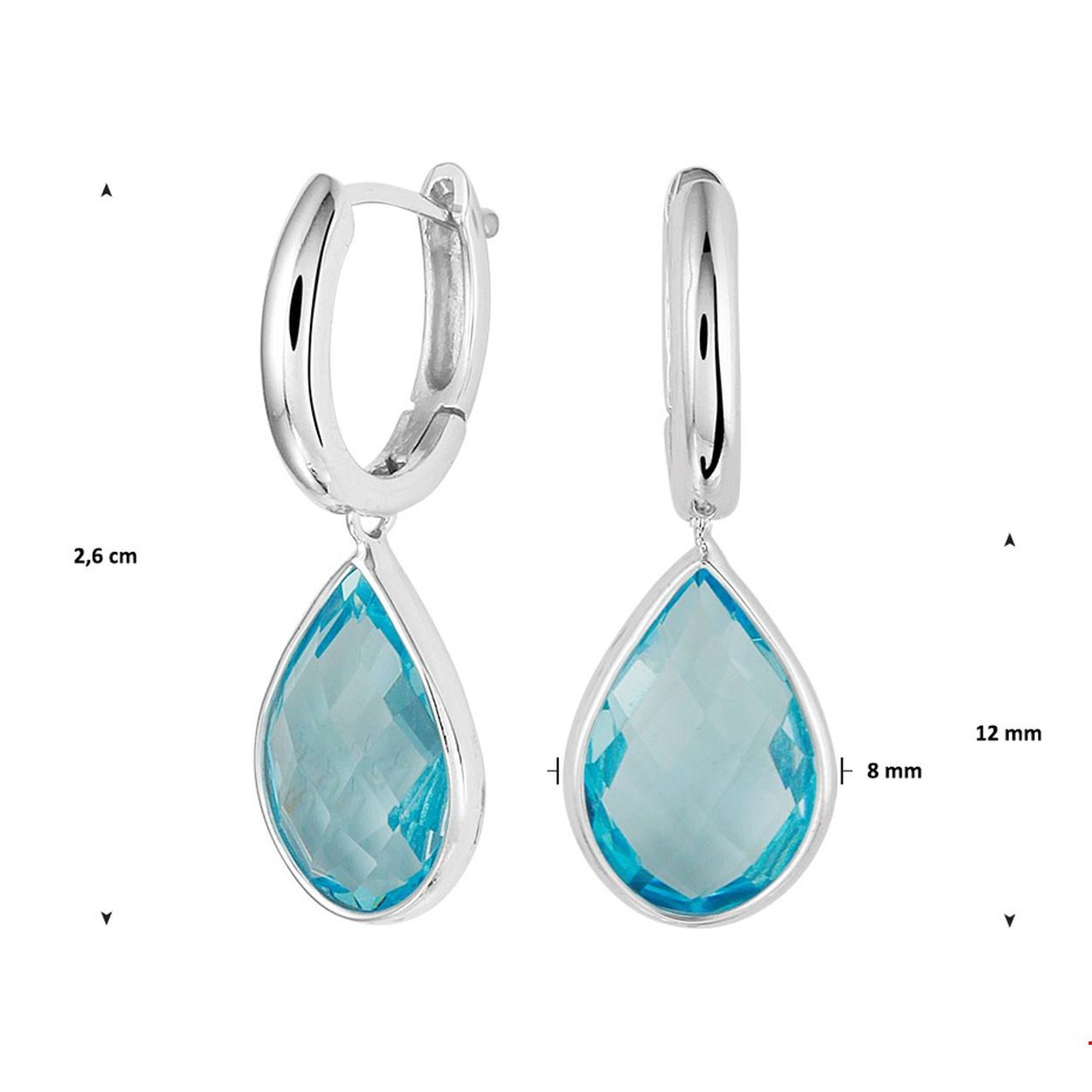 Helemaal hip zijn de oorhangers met peervormige kleursteen van 8x12mm. Deze variant met blauw topaas is iets wat zeker niet kan ontbreken in je assortiment. De hoogte van de oorbel is 26mm, en de breedte 12mm. Hij is gemaakt van 14k witgoud en sluit met een scharnier.
