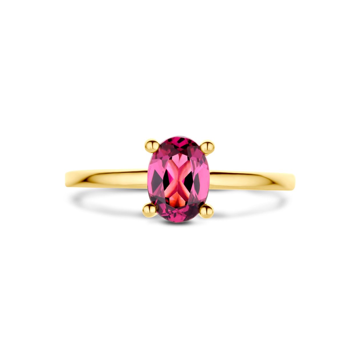 14k Geelgouden ring uitgevoerd met roze rhodoliet. De steen heeft een afmeting van 7x5mm.